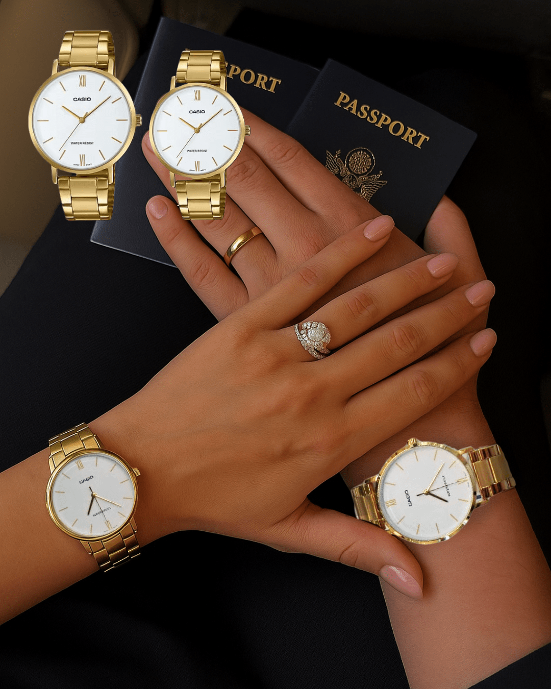 Un set elegante y sofisticado que refleja seguridad y estilo. El dorado de estos relojes los convierte en protagonistas, ideales para parejas que desean proyectar lujo discreto y buen gusto. Un detalle perfecto para aniversarios o momentos especiales.