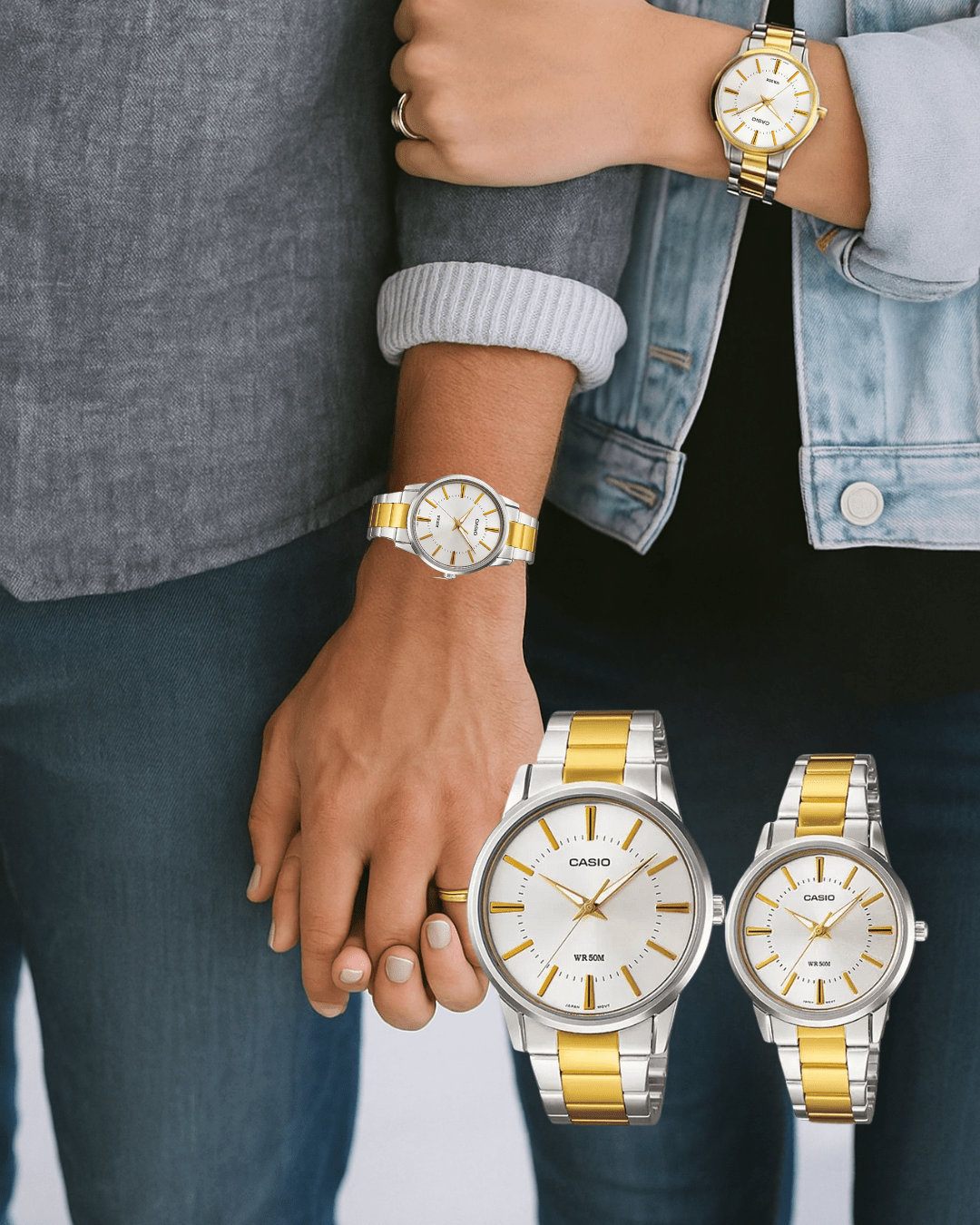 Este par de relojes combina el acero inoxidable con sutiles detalles dorados. Son perfectos para quienes disfrutan de lo clásico y atemporal, ya que se adaptan tanto a looks formales como casuales. Representan la unión de la sobriedad con un toque de brillo que resalta en cada ocasión.